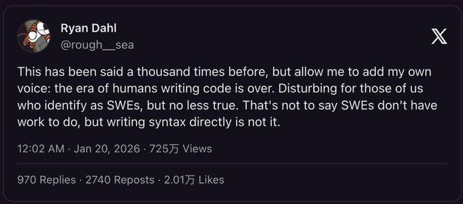 其影响力已深入顶尖技术从业者群体。一年前创造了“氛围编程”一词的OpenAI前科学家Andrej Karpathy坦言,长期使用AI编码已导致其手动编程能力逐步退化。Vercel首席技术官Malte Ubl称其核心工作转变为“纠正AI错误”,NodeJS创始人Ryan Dahl更直言“人类手写代码时代已结束”。工具创建者Boris Cherny透露,团队近100%代码由Claude Code结合Opus 4.5完成,Linux创始人Linus Torvalds亦成为此类工具的活跃使用者。